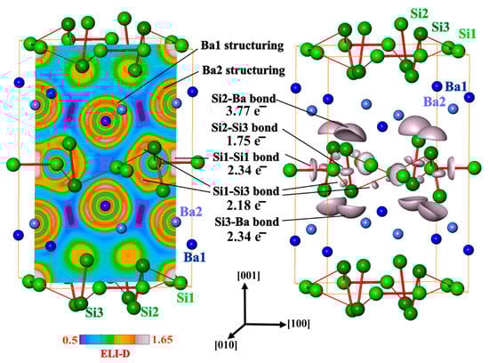 Electron localizability indicator and atomic interactions in BaSi3: (left) distribution of ELI-D in the (200) plane reveals structuring of the penultimate shells of Ba1 and Ba2 as well the Si1-Si1 bonds; (right) the isosurface of ELI-D for the value of 1.5 shows Si1-Si1, Si1-Si3 and Si2-Si3 bonds as well as the five-atomic bonds Si2Ba4 and Si3Ba4.