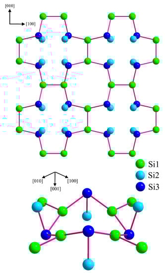 - Wosylus, A.; Rosner, H.; Schnelle, W.; Schwarz, U.Z. Crystal Structure Refinement and Electronic Properties of Si(cI16). Z. Anorg. Allg. Chem. 2009, 635, 700–703. [Google Scholar] [CrossRef]