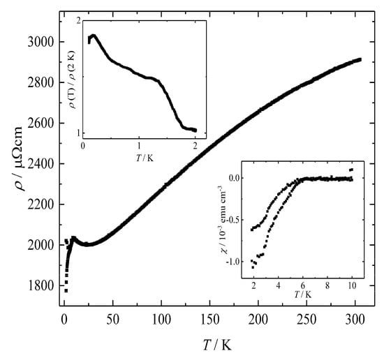 Electrical resistivity ρ was measured using a cuboid (1.00 mm × 1.80 mm × 0.90 mm) cut from a polycrystalline sample of cylindrical shape by a direct-current four-probe method carried out on a PPMS (Quantum Design International, San Diego, USA) AC transport option, 0.11 to 2.0 K and 2.0 to 305 K). The inaccuracy of ρ was estimated to be 20%, because of the intricate contact geometry. The measurement of magnetic susceptibility χ was conducted using a polycrystalline sample of cylindrical shape (diameter 1.0 mm, length 1.0 mm) and a SQUID magnetometer (MPMS XL-7, Quantum Design).