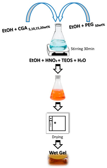 PEG (50 wt%) and CGA of different percentages (5, 10, 15, 20 wt%) were dissolved in ethanol and added to the silica matrix (Figure 1). In the solution, the molar ratios between the reagents were: EtOH/TEOS = 6.2, TEOS/HNO3 = 1.7 and H2O/TEOS = 6.
