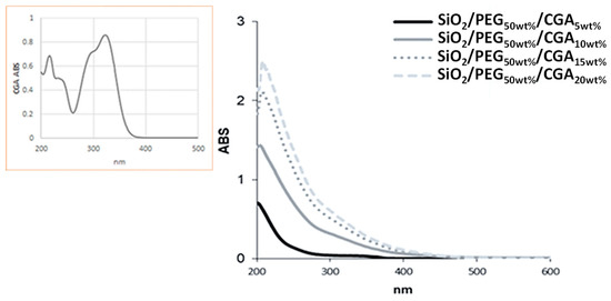 In order to evaluate the incorporation of CGA in the SiO2/PEG-based matrix, the synthesized hybrids were subjected to ultrasound-assisted extraction in a hydroalcoholic solution, and the obtained extracts were investigated by UV–Vis spectroscopy. All the UV–Vis spectra showed a hypsochromic shift of the characteristic bands of CGA, probably due to the occurrence of structural modifications. These results allowed us to deduce that CGA was securely trapped inside the matrix (Figure 2).