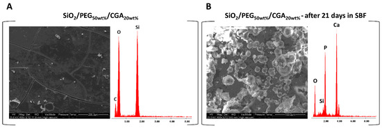 (A) Representative SEM micrographs of SiO2/PEG50wt%/CGA20wt% hybrid and EDX analysis before exposure to simulated body fluid (SBF); (B) a representative SEM micrographs of SiO2/PEG50wt%/CGA20wt% hybrid and EDX analysis after 21 days in SBF.