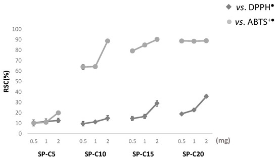 Radical scavenging capacity (RSC, %) versus DPPH (2,2-diphenyl-1-picrylhydrazyl) e ABTS+ (2,2’-azino-bis(3-ethylbenzothiazoline-6-sulphonic acid) radicals of synthesized SiO2/PEG-based hybrids. Values are the mean ± SD of measurements carried out on three samples (n = 3), analyzed three times. SP-C5 = SiO2/PEG50%/CGA5%; SP-C10 = SiO2/PEG50%/CGA10%; SP-C15 = SiO2/PEG50%/CGA15%; SP-C20 = SiO2/PEG50%/CGA20%.