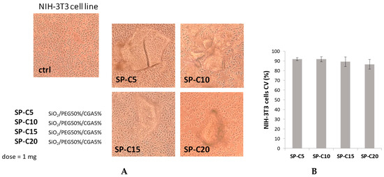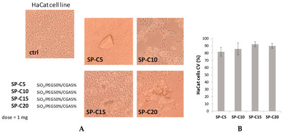 These data obtained highlight that the different hybrids do not induce morphological changes and cytotoxic effects on the murine fibroblast and human keratinocyte cell lines tested. In particular, the sample containing a CGA amount equal to 15 wt% induced a slight increase in the percentage of HaCat viable cells, compared to other hybrids (Figure 6), whereas the NIH-3T3 cell viability did not change in response to the different materials used (Figure 7).