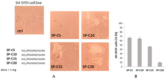 On the contrary, cytotoxic effects were observed for all neuroblastoma cell samples, even when the lowest dose of chlorogenic acid (5 wt%) was entrapped. The cytotoxicity becomes more pronounced with the increase of the CGA amount, reaching about 90% of cell proliferation inhibition at the highest weight percentage (Figure 8). This could be explained taking into account the so-called double-edged sword behavior of phenols and polyphenols [27], meaning that they can be used as antioxidant compounds against oxidative stress at lower doses and as pro-oxidant agents at higher doses. This is in line with our previous findings, which explored the growth inhibitory effect of SiO2/PEG/CGA hybrids—with lower amounts of the polymer—against breast cancer and osteosarcoma cell lines [28]. In this context, these encouraging data suggested the ability of the investigated hybrids to induce a consistent variation of protein levels, such as cyclin-dependent kinase inhibitor p21 and caspase-3. Furthermore, the herein observed pro-oxidant effects could depend also on environmental conditions, such as the pH and the presence of transition metals, particularly copper. A viable hypothesis reported in the literature concerns the reduction of Cu(II) to Cu(I), which becomes available in Fenton-like reactions, i.e., promoting the formation of reactive oxygen species [29]. The relationship between phenols and copper was previously investigated in SH-SY5Y cells, treated with oleuropein. The authors demonstrated that depleting cells of copper by treatment with the copper chelator triethylenetetramine, which binds copper with higher affinity than oleuropein, was less toxic than oleuropein with copper-adequate cells [30].
