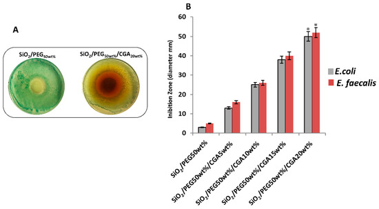 E. coli and E. faecalis were inoculated in presence of 100 mg of the hybrid powders. Figure 9A shows a representative image of the zones of inhibition that are clearly visible when E. coli was incubated with high amounts of CGA, compared with the hybrids containing only PEG. The results of the diameter of the zone of inhibition (Figure 9B) of all the hybrids, suggested that the materials exhibited strong activity against E. coli and E. faecalis in function of the CGA content, due to disruption the bacterial cell membrane, which lead to cell death [31,32,33]. This happened despite the different cell wall structures of either model bacteria (Gram-positive and Gram-negative).