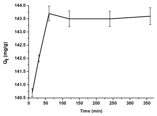 The effect of the contact time for the adsorption of BZC onto MSN is presented in Figure 4. MSN has a good adsorption capacity, within 60 min the equilibrium being achieved. There was no significant change between the samples from 1 h to 6 h.