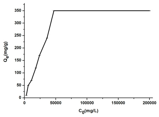 Figure 7 illustrates the effect of initial BZC concentration against adsorption onto MSN. An increase of the equilibrium values from 18.56 to 352 mg/g for the adsorbed amount of the drug onto MSN was noticed when the initial drug concentration was increased from 3000 to 50,000 mg/L. For values of C0 higher than 50,000 mg/L, the values of qe are almost unchanged.