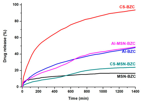 In vitro release of BZC was investigated both in SIF (pH 7.4) and SGF (pH 1.2). Figure 8 and Figure 9 show the amount of BZC released from MSN, from the two biopolymers and from the corresponding hybrid systems. At pH 1.2 (Figure 8), the systems CS-BZC and CS-MSN-BZC release a higher amount of drug than Al-BZC and Al-MSN-BZC systems due to the high swelling degree of CS in SIF [30]. At pH 7.4, the amount of the drug released within 24 h from the CS was higher than for Al also due to the good swelling behavior of the biopolymer in SIF which favors the diffusion of the drug molecules. Conversely, the lower release amount of BZC from Al matrix was attributed to a higher crosslinking density of the polymer which slows down considerably the diffusion of the drug and inhibits the crossing of water molecules through the polymer chains. These results are in good agreement with Xiujuan Huang and coworkers who report that the delivery of the drug might be determinate by varying the amount of sodium alginate and CaCl2 concentration [30]. Moreover, Figure 8 and Figure 9 show that the amount of BZC released from MSN-BZC systems is lower than the amount of drug released from the CS-MSN-BZC and Al-MSN-BZC hybrid materials. These results were attributed to a good dispersion of MSN in polymer matrices which reduced nanoparticles agglomeration and enabled a better drug diffusion.