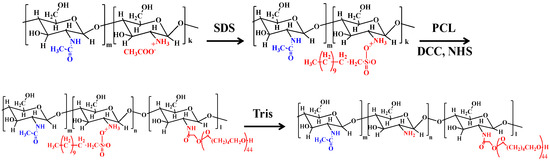 ε-Caprolactone (ε-CL), CS (molecular weight (Mw) = 110–150 kDa), Tin (II) 2-ethylhexanoate (Sn(Oct)2), glycolic acid, sodium dodecyl sulfate (SDS), N,N’ dicyclohexylcarbodimide (DCC), and N-hydroxysuccinimide (NHS) were obtained from Sigma (Steinheim, Germany). All other chemicals and solvents were of analytical grade and were used without further purification. PCL functionalized with one terminal carboxylic acid moiety (PCL-COOH) was synthesized by ring opening polymerization as described previously [34]. In a typical synthesis, ε-CL (10.0 g, 87.6 mmol), glycolic acid (0.22 g, 2.9 mmol), and Sn(Oct)2 (0.0048 g, 0.012 mmol) were added into a round bottom flask. The flask was heated at 140 °C for 18 h under a N2 atmosphere and continuous stirring. Next, the flask was cooled to room temperature and the obtained solid was dissolved in tetrahydrofuran (THF) and then poured into methanol to remove any unreacted monomer and the catalyst (Sn(Oct)2). Finally, the precipitate was collected via centrifugation, washed with methanol, and dried under vacuum to obtain the product, PCL-COOH, in the form of a dry powder. In the second step, the PCL-COOH prepared above was used for the synthesis of the graft copolymer, CS-g-PCL (see Figure 1) [30] (Cai et al., 2009). Briefly, the process involved first the formation of an organosoluble complex of CS with SDS (SDS/CS/Complex) (SCC), by simply mixing an acidic solution of CS (1.0 g, 6.1 mmol of the repeating units) in 200 mL of 2% v/v acetic acid) with a solution of SDS (2.0 g, 6.9 mmol) in water under continuous stirring. The mixture was stirred overnight at room temperature, before collecting the precipitate by centrifugation and washing it several times with nanopure H2O. The final product was obtained by freeze-drying. Next, the activated ester form of PCL-COOH was prepared by dissolving PCL-COOH (0.2 g, 3.9 × 10−5 mol), NHS (9.0 mg, 7.8 × 10−5 mol), and DCC (16 mg, 7.8 × 10−5 mol) in 50 mL of dimethylformamide (DMF). The reaction mixture was stirred at room temperature under a N2 atmosphere for 24 h and then filtered. The filtrate was dried under vacuum to yield the active ester derivative (PCL-COO-NHS), which was then reacted with the amine groups of SCC. In a typical process, PCL-COO-NHS was dissolved in 5 mL N-methylpyrrolidinone and subsequently added into the solution of SCC in dimethyl sulfoxifde (DMSO) under continuous stirring. The reaction was allowed to proceed at room temperature for 48 h under an inert atmosphere and was subsequently dialyzed against DMSO (membrane with molecular weight cut-off MWCO 14000Da) to remove any unreacted PCL-COOH and the excess of NHS and DCC. Next, SDS was removed from the SCC-g-PCL graft copolymer by precipitation into a 15% tris(hydroxymethyl)aminomethane (Tris) aqueous buffer solution. The precipitate was washed several times with the 15% Tris solution, DMF, and nanopure water, and was finally lyophilized to obtain the CS-g-PCL copolymer in a spongy-like form.