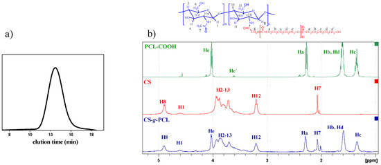 Gel permeation chromatography (GPC) of PCL-COOH (a) and 1H NMR of PCL-COOH, CS, and Cs-g-PCL (b).