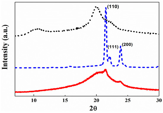 XRD measurements were performed to determine the influence of the PCL-grafted chains on the crystallinity of the CS backbone. Figure 5 shows the XRD patterns for PCL-COOH, CS, and the CS-g-PCL graft copolymer. The XRD pattern of PCL-COOH shows three strong and sharp peaks at 21.5°, 22.1°, and at 23.9°, which are characteristics for PCL and are attributed to the (110), (111), and (200) crystallographic planes of PCL, respectively [48]. The XRD curve for CS exhibits two characteristic broad peaks at 10.5° and 20.0° corresponding to the crystalline structure of CS and a shoulder at 22.2°, which indicates the presence of amorphous polymer regions [49,50]. Finally, the XRD pattern of CS-g-PCL shows the two characteristics peaks of PCL at 21.5° and 22.1°. The intensity of these peaks is significantly reduced compared to those of the PCL homopolymer, verifying the decrease in the crystallinity of PCL in the graft copolymer, in good agreement with the DSC results discussed above. Moreover, the CS peak at 10.5° has disappeared in the XRD pattern of the graft copolymer, while the peak at 20.0° has become much broader, suggesting a decrease of the crystallinity of CS in the graft copolymer due to the presence of the grafted PCL chains along the CS backbone, which hinder the interchain hydrogen bonding interactions and lead to changes in the CS microstructure [9].