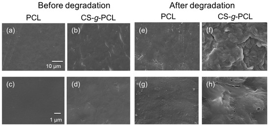 SEM images (Figure 6) of the as-prepared PCL and CS-g-PCL disc samples (left, Figure 6a–d), and after 21 days in α-MEM (right, Figure 6e–h), were obtained. The as-prepared PCL sample (Figure 6a,c) has a very smooth and uniform surface, whereas the CS-g-PCL sample (Figure 6b,d) displays some inhomogeneity and a slightly rough surface attributed to the presence of CS in the copolymer. After 3 weeks of incubation in α-MEM, both the PCL-COOH and CS-g-PCL discs undergo significant morphological changes as evidenced by SEM. The PCL material (Figure 6e,g) exhibits an increase in surface roughness and surface inhomogeneity in the form of sparse small holes. On the other hand, the CS-g-PLC copolymer sample depicts pronounced morphological alterations and a large increase in surface roughness, whereas small holes and ruptures are observed at a higher magnification (Figure 6f,h). These results are in good agreement with the higher degradation rate of the graft copolymer sample compared to the PCL-COOH homopolymer, discussed above, and was attributed to the more hydrophilic nature of the copolymer and, thus, the higher water uptake.