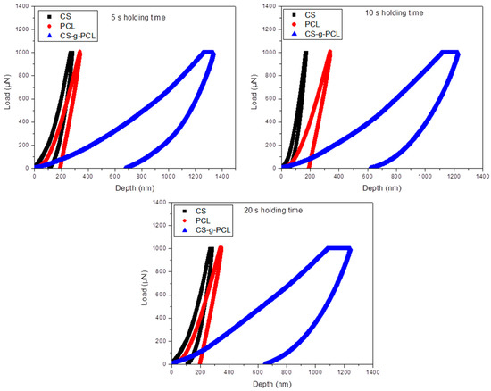 Nanoindentation tests were performed at various applied loads and holding times reaching different penetration depths as shown in Figure 7. The load control experiments followed a trapezoidal loading-unloading curve depending on the hold time (Figure 8). Figure 7 shows typical load–indentation depth curves for the CS-g-PCL and CS samples for three different loading hold times (5, 10, and 20 s) at various maximum depths. Taking into account the geometry of the Berkovich tip, the smooth load-unload curves indicate that there is no significant porosity in the samples synthesized and tested in this study [51]. The load–depth curves for CS-g-PCL samples show lower slopes of dP/dh (stiffness values) in the unloading step and higher values of maximum nanoindentation depths compared with pure CS samples. The higher plastic deformation is observed for the CS-g-PCL sample, because, at the same applied load, the indenter penetrated the sample at a higher indentation depth followed by higher dissipation of energy compared to the CS sample. The dissipation energy, as a quantitative reflection of the viscous effect, is due to the internal friction or plastic deformation energy inside the copolymer. The lower stiffness for the CS-g-PCL sample is attributed to the lower degree of crystallinity of CS chains in the graft copolymer. A similar effect has been reported earlier by [10], which claimed that blending of CS and PCL occurs via hydrogen bond formation between the functional groups present in the CS molecule (–NH2 and –OH) and the carbonyl groups of PCL, which also resulted in the suppression of the PCL crystallization [10,24,30,33,52].
