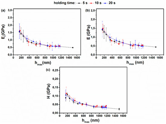 (a) Reduced modulus (Er); (b) Young’s modulus (E); and (c) hardness (H) values as a function of maximum indentation depth for 5, 10, and 20 s holding time for the CS-g-PCL copolymer.