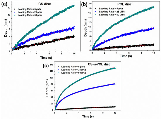 Evolution of penetration depth as obtained at different loading rates and at a constant applied load, as a function of time, for the (a) PCL; (b) CS; and (c) CS-g-PCL samples.
