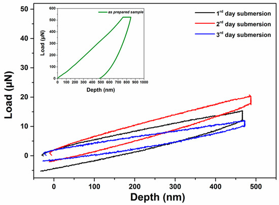 Load-unload curves for the CS-g-PCL sample after submersion for 1, 2, and 3 days in α-MEM at 25 °C. The inset shows the load-unload curve for the as-prepared sample.