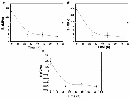 (a) Reduced modulus (Er); (b) Young’s modulus (E); and (c) hardness (H) values for the CS-g-PCL sample after submersion in α-MEM.
