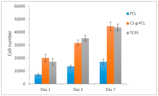 One of the first biocompatibility-related questions arising for the CS-g-PCL discs is whether they support cell adhesion, viability, proliferation, and tissue growth in vitro. We therefore investigated the viability of WJ-MSCs on CS-g-PCL discs following the good attachment of the cells on the material, and the cell proliferation after 3 and 7 days of culture. In a previous study, we showed a strong initial adhesion of WJ-MSCs seeded on two-dimensional films of the CS-g-PCL copolymer, and depicting a well-spread, flattened cell morphology onto the substrate [34]. Here, we show the viability of WJ-MSCs on PCL and CS-g-PCL discs as well as on a tissue-culture-treated polystyrene (TCPS) control after 1, 3, and 7 days in culture (Figure 13). Cells exhibit a proliferation increase after 3 and 7 days on both materials, with a more pronounced increase on the CS-g-PCL discs, for which more than a 2-fold increase in proliferation is found. These values are comparable to the TCPS control, and in accordance with previously reported results on CS-g-PCL copolymeric films [34]. On the PCL samples, the number of viable cells measured on day 1 is lower compared to the cell number on CS-g-PCL due to the hydrophobicity of PCL, which prohibits strong cell adhesion [66]. Similarly, a higher increase in cell proliferation for a CS–PCL blend compared to pure PCL was observed in scaffolds fabricated by melt stretching and multilayer deposition, employing pre-osteoblasts for bone tissue engineering [67]. Chitosan is well-known to favor tissue growth, especially in cardiac tissue regeneration [15,17].