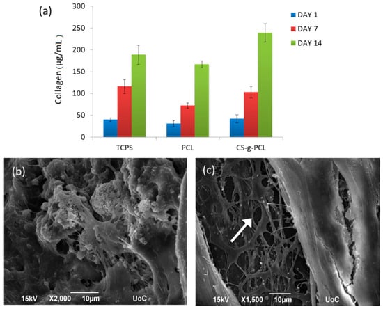 Figure 14 shows the levels of total collagen secreted by the WJ-MSCs cultured on PCL and CS-g-PCL discs and the TCPS control for 1, 7, and 14 days (Figure 14a). Representative SEM images depict WJ-MSCs grown onto the CS-g-PCL discs after 1 and 4 weeks in culture. We observe a dense network of well-adhered cells with spread morphology (Figure 14b) that are interconnected and cover the surface of the copolymer through a strong attachment onto the material. Interestingly, after four weeks in culture, we observe successive degradation of the CS-g-PCL disc (white arrow) (Figure 14c). Following cell infiltration into the pores of the discoid substrate, cells proliferate over a period of two weeks towards a new tissue formation as demonstrated by the production of extracellular collagen. This is evidence of supported cell growth into tissue upon degradation of the material. Chitosan constructs, among different naturally derived hydrogels used for chondrogenesis, have been shown to accumulate the highest levels of sulfated glycosaminoglycan (sGAG), and synthesize the highest levels of collagen, both markers of the extracellular matrix (ECM) formation [68]. Similarly, pre-osteoblastic cells cultured on CS-g-PCL films indicated an increased collagen production after 7 days, as well as significantly enhanced matrix biomineralization and osteopontin levels after 14 days compared to the TCPS control [69].