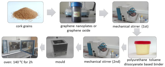 The preparation of the specimens commenced by the authors consists of four main steps. At first, it was necessary to weight the exact amount of constituents, which were necessary to obtain the assumed density of 160 kg/m3 in an analytical balance. It shall be noticed that the weight % (wt.%) is herein related to the total weight of the mixture—i.e., cork grains, binder, water and graphene. In the second step, the graphene nanoparticles or graphene oxide was added to the agglomerated cork. The components were mixed for 3 h. Hereafter, water (5 wt.%) was added to the cork part while the blend was kept homogenized using a mixer. One minute later, the binder (10 wt.%) was introduced to the mixture. In the last step, the mixture was compressed by a pressing machine until the desired density and shape was achieved. Furthermore, the samples were heated up to the temperature of 140 °C and held at that temperature for additional 2 h. The sequential production process of the cork-graphene samples is depicted in Figure 1.