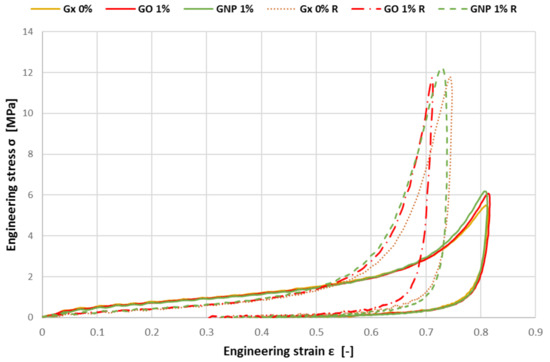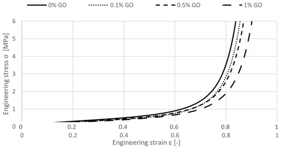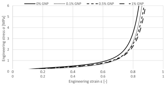 Figure 5 shows the results of the GNP-enriched specimen. It is visible that the specimens present a similar behaviour compared to the GO-enriched specimen. Up to a strain of approximately 0.4, the curves are close to each other. After surpassing the total strain of 0.4, an elongated plateau stress is also recognizable. Here, the most visible beneficial effect is seen for a change from 0 to 0.1 wt.%.