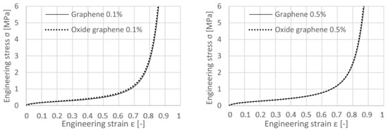 Comparing the results of equally GNP- and GO-enriched specimens with each other, Figure 6 shows very similar performances of the specimens that were enriched by 0.1 and 0.5 wt.% of GO and GNP, respectively. Their stress-strain curves are practically coincident.