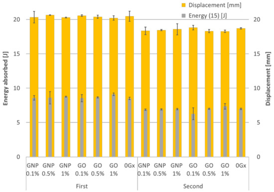 As cork is generally accepted as a material capable to withstand at least a second major impact, each specimen was tested for the second time in the same conditions. The behaviour of all the different samples is very similar. After analysing the results, the dynamic performance of GO- or GNP-enriched cork material can be stated as very comparable to each other, showing no significant difference, neither to the other type of enrichment nor to the untreated agglomerated cork. Figure 9 shows the overview of absorbed energy and displacement for the first and second impacts for each material configuration. For comparison purposes, a deflection threshold of 15 mm—marked as Energy(15)—was established. Such a value was set once all samples were able to withstand impacts at this stage.