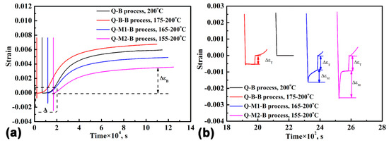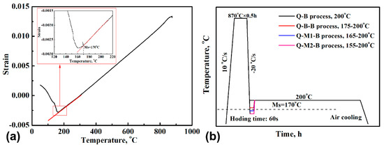 The calculated results are shown in Table 1, which shows that there was 5.4 vol. % and 15.2 vol. % martensite formed during the cooling process for the Q-M1-B specimen and Q-M2-B specimen, respectively. For the Q-B-B specimen, there was no further increase of the strain during the short holding at the first temperature, revealing that no phase transformation occurred during this process. During the increasing temperature process, there were dilatational strains () that likely resulted from the thermal expansion.