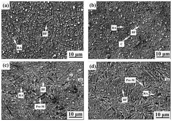 SEM observations of the specimen with different treatment process, (a) Q-B process, (b) Q-B-B, (c) Q-M1-B process, (d) Q-M2-B process. Note: BF, RA, Pre-M, and C represent bainitic ferrite, retained austenite, preformed martensite and cementite, respectively.