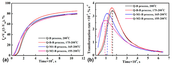 Figure 5 shows the variation of the normalized volume fraction of bainitic ferrite, (fB = VB/(1 − VM)), and the corresponding transformation rate as a function of increasing holding time. During the initial holding process at 200 °C, the transformation rate is notably higher for the two Q-M-B processes. It is the highest for the Q-M2-B process as compared to the Q-B and Q-B-B processes. However, for the two Q-M-B processes, the transformation rate reached the peak value very quickly. Moreover, for the Q-M2-B process, the peak value of the transformation rate is smaller and the time needed for reaching the peak value is shorter. For the two processes without pre-formed martensite, the transformation rate was always slightly higher for the Q-B-B process than for the Q-B process. The peak values for the transformation rate of Q-B and Q-B-B processes are higher than the two Q-M-B processes, as shown in Figure 5b. It can also be seen that the transformation rate of the Q-B and Q-B-B processes are higher than the two Q-M-B processes after the peak rate. Moreover, the final transformation rate for the four processes is nearly the same. The higher transformation rate for the Q-B-B process is likely responsible for the improved transformation extent of the austenite.