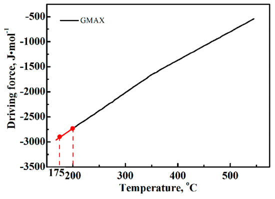 The free energy difference (∆G) between austenite and ferrite provides the driving force for the transformation. Upon decreasing the temperature, the ∆G increases and it increases the driving force for the transformation. According to the MUGG83 thermodynamic model (MUGG83, Mathew Peet and H.K.D.H. Bhadeshia, Cambridge, UK) [34,35], the ∆G for the nucleation of bainitic ferrite of the present steel can be estimated, as shown in Figure 6. It can be observed that with decreasing temperature, the ∆G increases in a nearly linear fashion. Therefore, the ∆G value at 175 °C for the present steel can be estimated by extension of the line, even though the lowest temperature in this mode is 200 °C. Using this approach, the ∆G200 and ∆G175 were determined to be −2720 J/mol and −2920 J/mol, respectively.