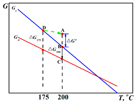 For the Q-B-B process, the specimen was held at 175 °C for 60 s, and then the temperature was increased to 200 °C at a rate of 10 °C/s. The SEM observation and transformation kinetics result have demonstrated that the followed transformation process was accelerated and improved as compared to the conventional Q-B process, indicating that the driving force at 200 °C is higher than −2720 J/mol and there exists an additional driving force due to the first step treatment. It is probably the hysteresis free energy, ∆G’, due to the thermal hysteresis effect taking place when the specimen was heated to 200 °C from 175 °C, as shown in Figure 7. Moreover, the hysteresis free energy should be influenced by the heating rate, where a faster heating rate results in a higher hysteresis free energy. The increased free energy change provided a larger driving force for transformation, which inevitably increased the amount of nucleation site for bainitic ferrite and then accelerated the transformation process. This resulted in a reduced amount of retained austenite and an increased amount of bainitic ferrite formed at the same austempering time compared to the Q-B specimen, as shown in Table 1.