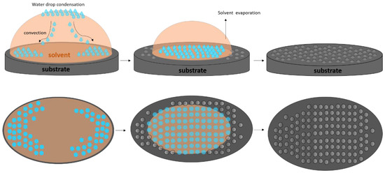 In brief, the breath figures were formed when a polymer solution in a high volatile solvent was cast onto a substrate under adequate humidity (Figure 1). The evaporation of the solvent induced a cooling at the solvent/air interface. This process favored the condensation of water from the humidity in the solution. Condensed water droplets formed a honeycomb pattern on the surfaces [14].