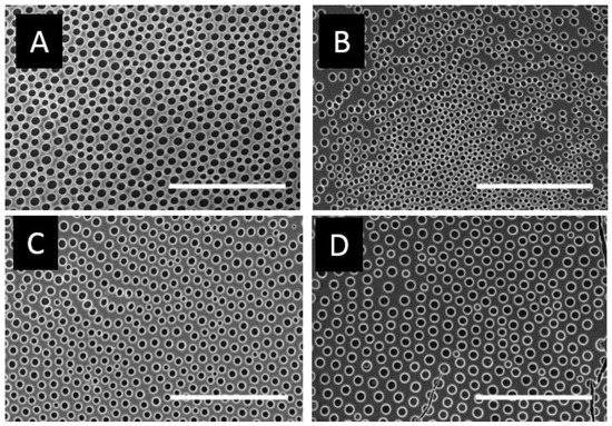 Several authors reported that an increase of the polymer molecular weight usually leads to larger pore sizes [44,45]. However, in our poly(x-chlorostyrene) systems there was no significant variation between the diameters of the polystyrene and the chlorine substituted polymers. That is, the presence of the chloro-substitution could have increase the pore size, due to the influence of the side groups, avoiding the use of high molecular weight polystyrene samples to obtain similar pore size.