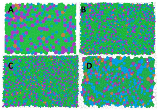 where n is the coordination number of each Voronoi, i.e., the number of sides of the polygon, and Pn is the fraction of the polygons having the coordination number n. That is, Voronoi tessellation method calculates the probability of the occurrence of four (P4), five ((P5), six—which is a perfectly hexagonal lattice—(P6), seven (P7), or eight (P8) As a reference, for a perfectly ordered hexagonal array, i.e., an ideal hexagonal lattice, the conformational entropy is 0, whereas the entropy of a completely random pattern is 1.71 [18,39,40,41,42,43].