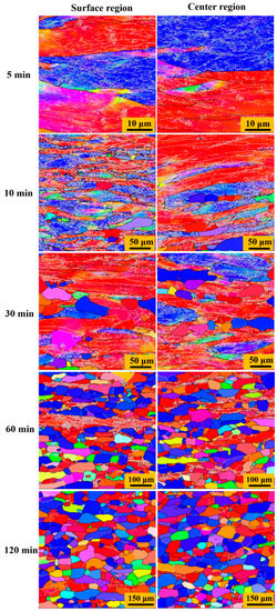 - Bocos, J.L.; Novillo, E.; Petite, M.M.; Iza-Mendia, A.; Gutierrez, I. Aspects of orientation-dependent grain growth in extra-low carbon and interstitial-free steels during continuous annealing. Metall. Mater. Trans. 2003, 34, 827–839. [Google Scholar] [CrossRef]