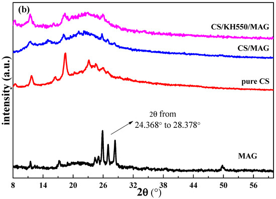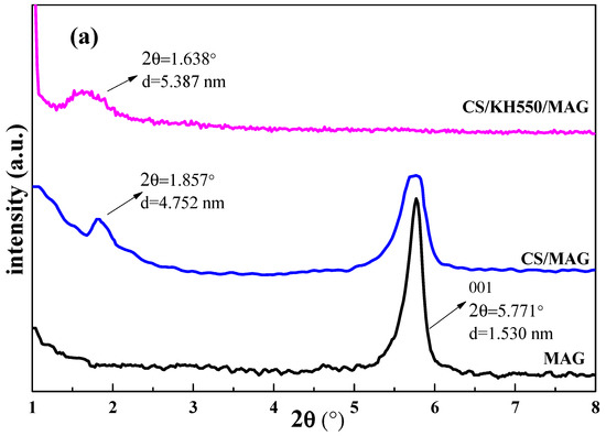 Figure 2 shows that the small-angle and wide-angle XRD spectrums of the CS/MAG and CS/KH550/MAG hybrid membranes were tested, respectively. The Figure 2a shows that in the small-angle XRD spectrums, the 001 diffraction peaks of the CS/MAG and CS/KH550/MAG hybrid membranes moved in the direction of the small angle compared to the pure MAG [32], which demonstrated that both the hybrid membranes possessed the layered structure and their layered spacing was larger than the pure CS membrane and their layered spacings were 4.752 nm, 5.387 nm, and 1.530 nm. Because a large number of CS molecular chains were adsorbed into the layered structure, the organic and inorganic assembled in an orderly manner in the hybrid membranes. However, the CS/MAG membrane still had an obvious diffraction peak at 2θ = 5.771°, while the CS/KH550/MAG membrane did not perform similarly. It was shown that there were still some parts of the MAG layers not being inserted by the CS molecular chains, but the intercalated reaction of CS/KH550/MAG hybrid membranes was more complete after adding the KH550.