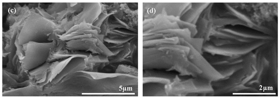 The cross-section SEM pictures of the CS/MAG hybrid membranes are shown in Figure 3a,b, while Figure 3c,d represent the cross-sectional SEM pictures of the CS/KH550/MAG hybrid membranes. Like the result of the XRD analysis, the MAG layers in the CS/KH550/MAG hybrid membranes were inserted more completely and deeply than those in the CS/MAG hybrid membranes, and the layered spacing of the CS/KH550/MAG hybrid membranes was much larger compared to the CS/MAG hybrid membranes. From the angle of the microstructure, the interfacial compatibility between the MAG layer and the CS molecular chain was significantly enhanced after adding the KH550 and which was made the CS reaction to insert in the molecular chains [25].