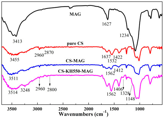 Fourier transforms infrared spectroscopy (FTIR) spectra of CS/MAG and CS/KH550/MAG hybrid membranes.