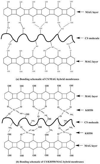 Figure 5 clearly shows the bonding schematics of both the CS/MAG and CS/KH550/MAG hybrid membranes. The CS/MAG hybrid membranes were combined via chemical bonds and hydrogen bonds, and so were the CS/KH550/MAG hybrid membranes. The coupling reaction of KH550 between MAG and CS made more complicated bonds and a stronger bonding force.
