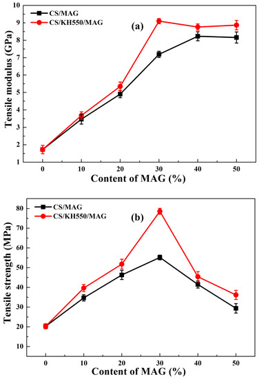 Figure 6 shows the mechanical properties of hybrid membranes with different content of MAG. As shown in Figure 6, when the quality ratio of CS and MAG was equal to 7:3, the tensile strength of both the CS/MAG and CS/KH550/MAG hybrid membranes reached the maximum. Under this proportion of quality ratio of CS and MAG, the tensile modulus and tensile strength of the CS/MAG hybrid membranes reached 7.19 GPa and 55.2 MPa, respectively, which were 4.16 and 2.72 times higher than the pure CS membranes (when the content of MAG is 0), respectively. The tensile modulus and tensile strength of the CS/KH550/MAG hybrid membranes reached 9.10 GPa and 78.6 MPa, respectively, which were 5.26 and 3.87 times of the pure CS membranes, respectively. The tensile strength of the CS/KH550/MAG hybrid membranes when the quality ratio of CS and MAG was equal to 7:3 in this study had been achieved in the range of nacre-like materials (70–130MPa) reported in other works of literature [3,4]. However, the strain to failure of the CS/MAG and CS/KH550/MAG hybrid membranes could still remain 9.6% and 10.8% at the quality ratio of CS and MAG to 7:3.