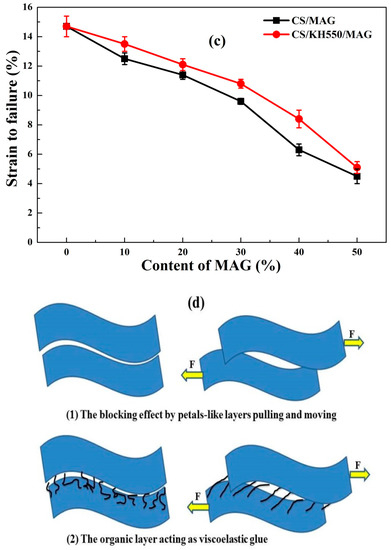 Mechanical properties of (a) tensile modulus, (b) tensile strength, (c) strain to failure, and (d) force schematic diagram of MAG layers pulling and moving of the CS/MAG and CS/KH550/MAG hybrid membranes.