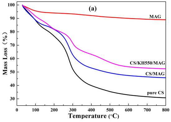 Figure 7 shows the TG and DTG curves of MAG, pure CS membranes, CS/MAG, and CS/KH550/MAG hybrid membranes. From Figure 7, two stages in the decomposition of pure MAG can be seen. The apparent adsorption water and bound water were stripped from 30 to 250 °C; the condensation reaction of Si–OH in the MAG was condensed into the siloxane mainly from 250 to 800 °C. The weightlessness of the pure CS membrane, CS/MAG, and CS/KH550/MAG hybrid membranes were divided into three stages. The apparent adsorption water and bound water were mainly stripped from 30 to 200 °C, and the weightlessness of thermal decomposition of the CS molecular chains and KH550 was mainly from 200 to 500 °C. At temperatures from 500 to 800 °C, the weightlessness of pure CS membrane was the stripping of pyrolysis products, but the weightlessness of CS/MAG and CS/KH550/MAG hybrid membranes not only included the removal of the thermal decomposition of organic matrix but also contained the condensation reaction of silicon hydroxyl in the remaining MAG layers.