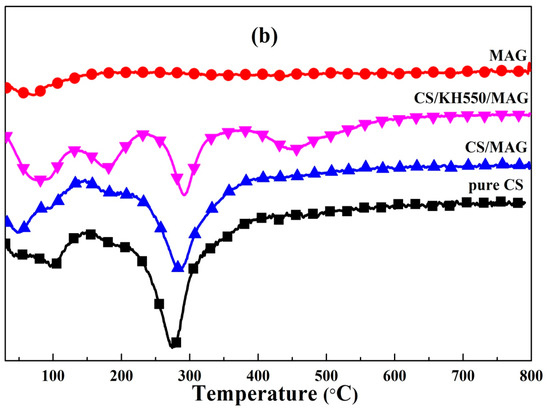 (a) Thermal gravimetric (DTG) and (b) differential thermal gravimetric (DTG) curves of MAG, pure CS, CS/MAG, and CS/KH550/MAG hybrid membranes.