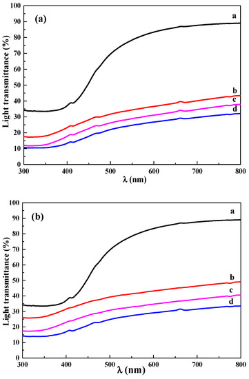 In order to investigate the light transmission of the hybrid membranes, an ultraviolet spectrophotometer was used to test the pure CS membrane and both hybrid membranes with different proportions of MAG. As shown in Figure 8, the transmittance of visible light area (400–760 nm) of the pure CS membrane was from 37% to 88%, and that of the CS/MAG and CS/KH550/MAG hybrid membranes was from 10% to 42% and from 15% to 50%, respectively. It was illustrated that even if adding the non-transparent MAG layers, the hybrid membranes still possessed a certain transmission of light. Comparing the curves of Figure 8a,b, the visible light transmittance of CS/KH550/MAG hybrid membranes under the same quality ratio of MAG was a little higher than the CS/MAG hybrid membranes, which illustrated that adding KH550 in the hybrid membranes increased the orientation of the “interpenetrating petals” layered structure [42].