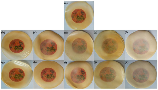The optical pictures of pure CS membrane (a), CS/MAG (b–f) and CS/KH550/MAG (g–k) hybrid membranes with different quality proportion, with (b–f) and (g–k) both corresponding to CS: MAG = 9:1; 8:2; 7:3; 6:4; 5:5, respectively.