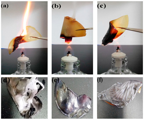 The burning and burned pictures of pure CS (a,d), CS/MAG (b,e), CS/KH550/MAG (c,f) hybrid membranes.