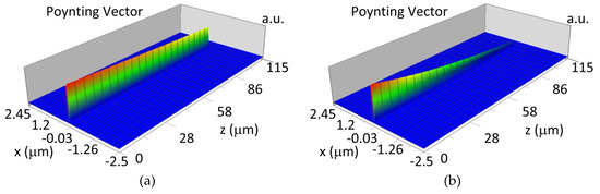 Propagation light in waveguide structure for TM01, dw = 237 nm (Poynting vector): (a) λ = 436 nm, HbO2, (b) λ = 436 nm, Hb, (c) λ = 560 nm, HbO2, (d) λ = 560 nm, Hb.