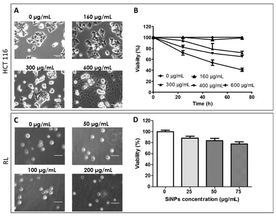 Toxicity of SiNPs on HCT-116 and RL cells was determined by measuring cell viability after the passive incorporation of increasing SiNP concentrations. For HCT-116, no toxicity was observed below 160 μg/mL. In the case of LumiLys 650 NPs at concentrations up to 160 μg/mL, more than 90% of the cells remained alive (Figure 2A,B). The viability reached 75% at 300 μg/mL and became less than 50% at 600 μg/mL, 72 h after incubation. Thus, a SiNPs concentration of 160 μg/mL was used for further experiments. In RL cells, a more drastic effect of LumiLys 650 NPs was observed. Cell viability became less than 60% at 100 μg/mL 24 h after incubation (data not shown). The viability reached 80% at 75 μg/mL 24 h after incubation (Figure 2C,D). Thus, a SiNPs concentration of 75 μg/mL was chosen for further studies.